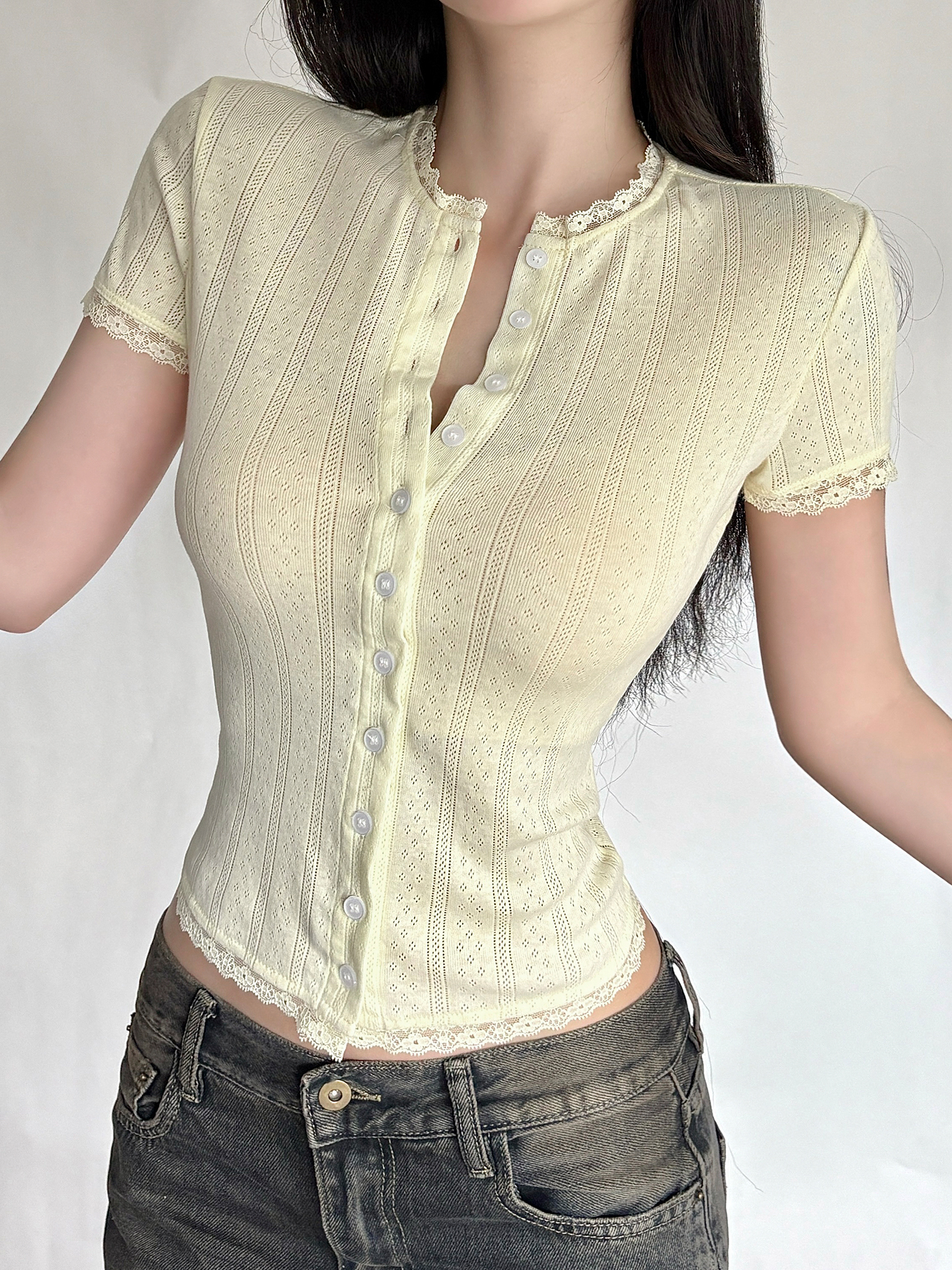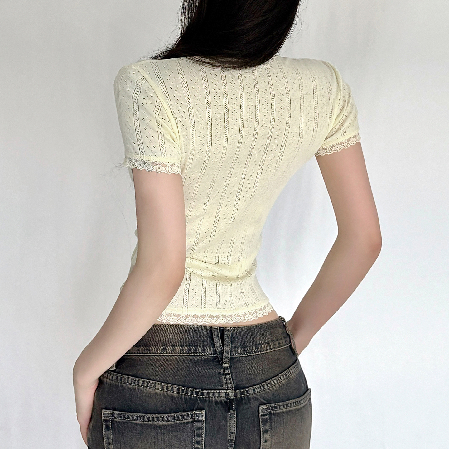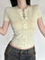 WEEKEEP Pure Desire Lace Paneled Crew Neck Slim Short Sleeve T-Shirt