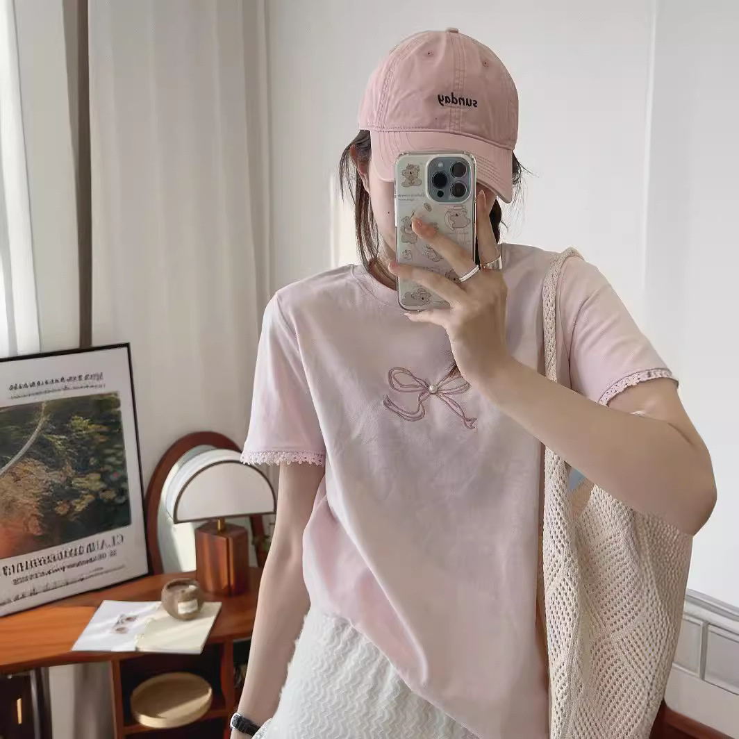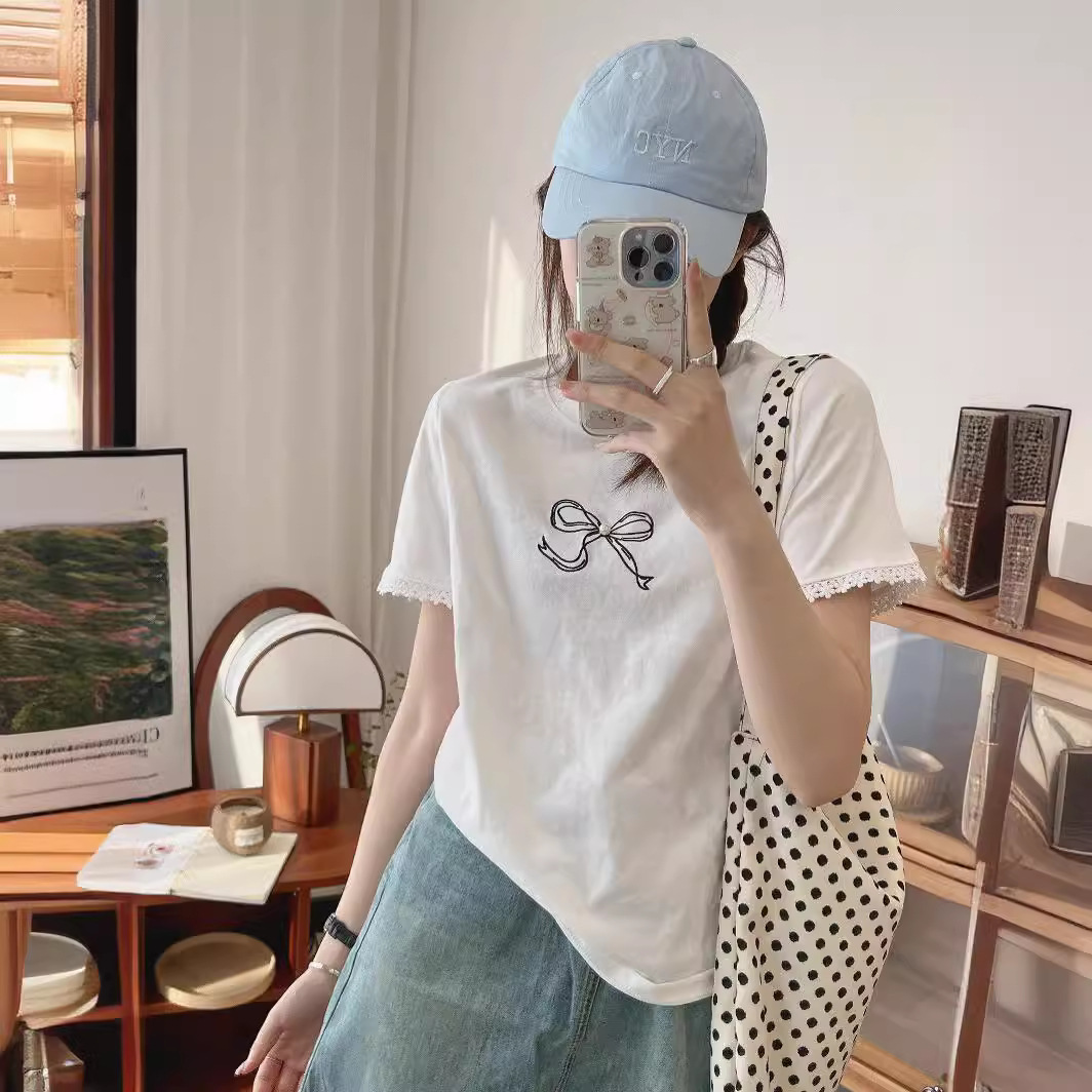 Women's babytee short-sleeved t-shirt with embroidered trendy bow