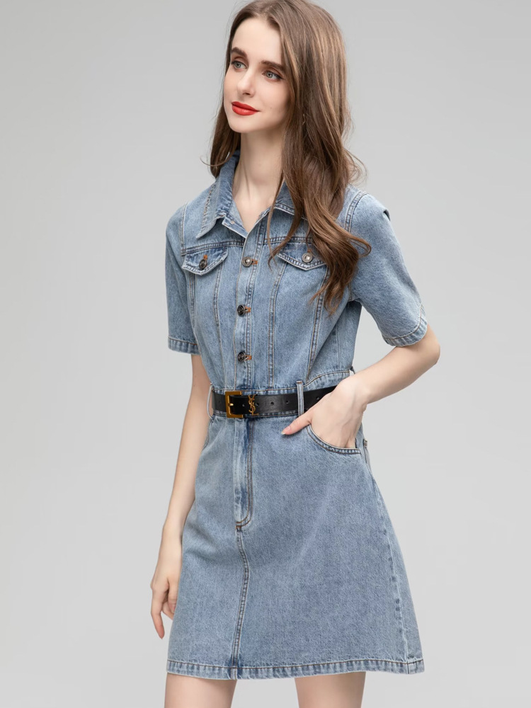 A-line jean dress with button collar, short sleeves and belt, high-end design