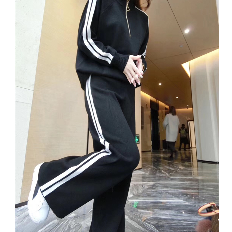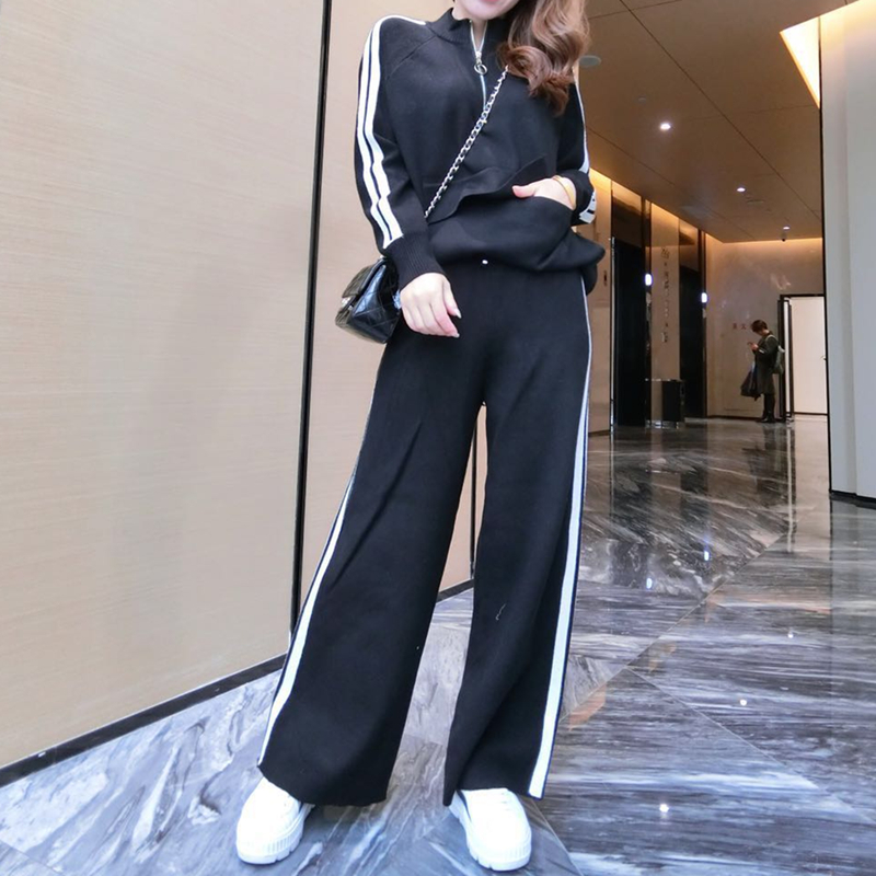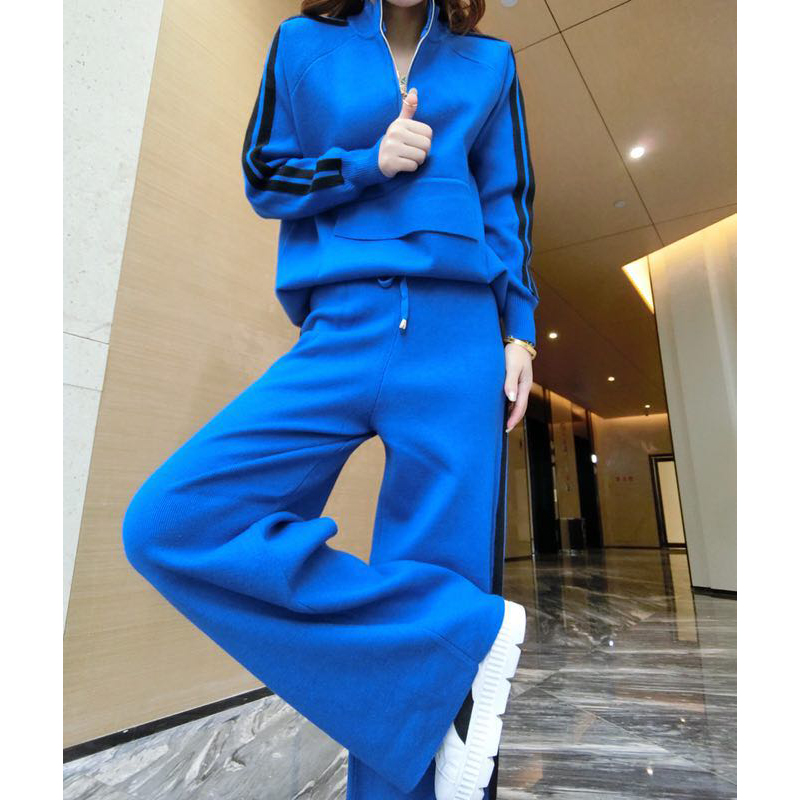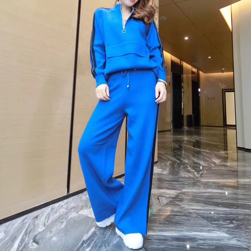 New Loose Knit Sweater Set Fashionable Casual Blue Sports Wide-leg Pants Two-Piece Set